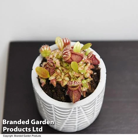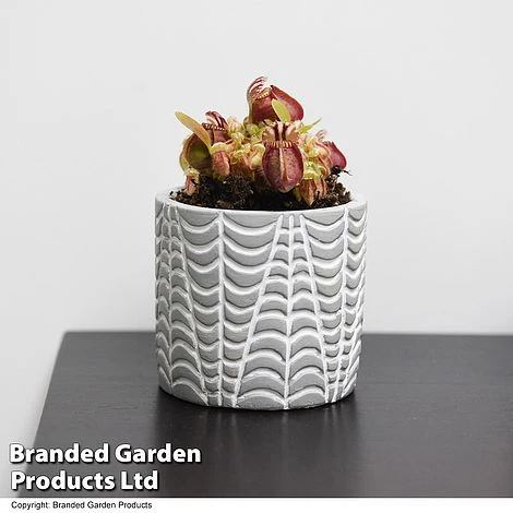 This Australian Pitcher Plant is a delightfully spooky specimen! The red/green pitchers squat amongst a sparse scattering of rounded leaves, looking like cute little monsters! The pitchers resemble gaping mouths with lips rimmed by teeth-like ribs whilst the pitcher lids are patterned with maroon veining. Cephalotus follicularis has two types of leaves: in spring, round and hairy non-carnivorous leaves are produced, whilst in summer, it bears carnivorous leaves that inflate into pitcher traps. This rare plant is native to just one small stretch of coast in Western Australia and is prized by collectors due to its unusual appearance and intricate detailing. It makes a unique specimen for a bright, south-facing windowsill or terrarium. RHS Award of Garden Merit. Height and spread: 10cm (4in).