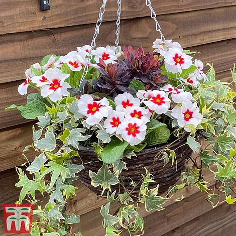 Our Starry Eyes mixed hanging basket delivers colour and interest that will last all winter long. A carefully selected combination of variegated, cascading Ivy contrasts beautifully with the seductive, dark foliage of Heuchera. These evergreens are crowned with a dazzling halo of white and pink blooms from Primrose ‘Jupiter’. The perfect focal point to brighten your front door from autumn right through to late spring! Height and spread: 25cm (10″).
